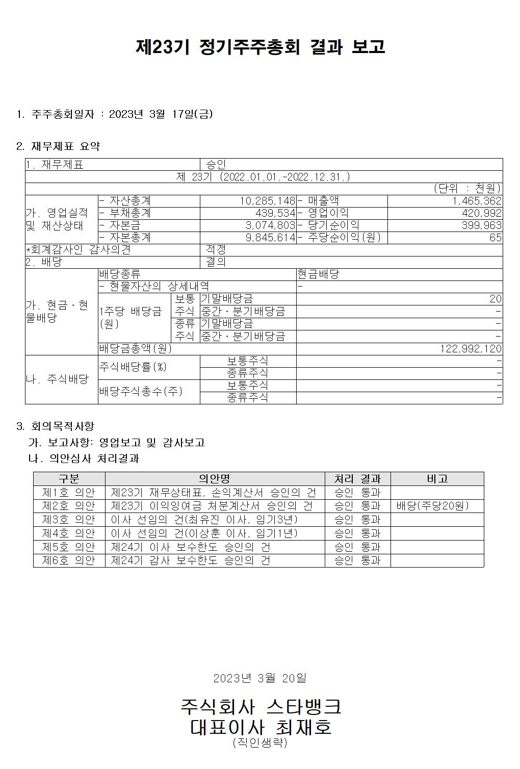 제23기 정기주주총회 결과보고
