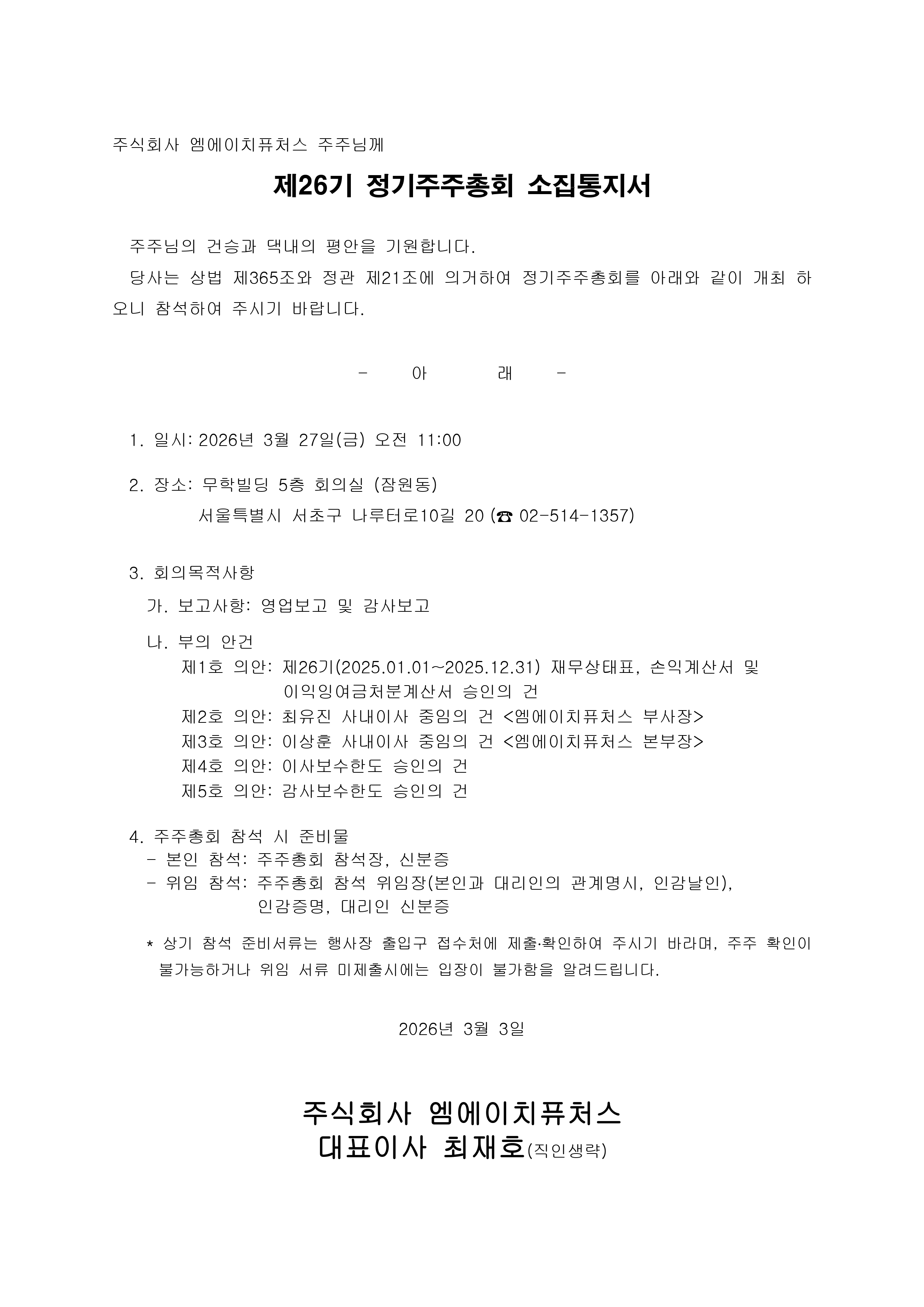 제26기 정기주주총회 소집통지서