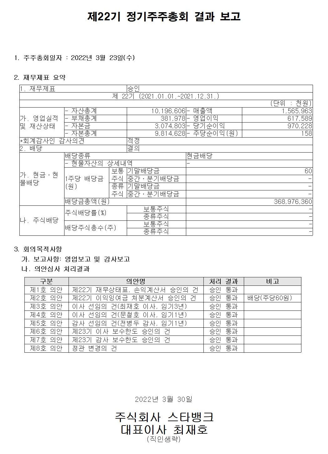스타뱅크 제22기 정기주주총회 결과 공고